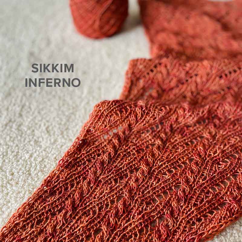 Der Schal wurde aus zwei verschiedenen Garnen hergestellt und ist in drei verschiedenen Größen erhältlich. Schalspannweite 118,5 cm, 148,5 cm, 163,5 cm (47,25", 59,25", 65,25").